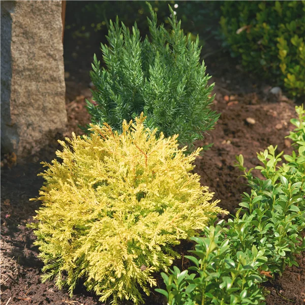 Auch als Solitärpflanzen sind Koniferen ein Blickfang für jeden Garten. Mit ihrem immergrünen Charme setzen sie vor allem in der dunklen Jahreszeit Akzente. Ein Highlight ist die wintergelbe Zwergbergkiefer "Pinus Mugo Carstens Wintergold", deren Nadeln sich von September bis April goldgelb verfärben. Der nordamerikanische Kriechwacholder (Juniperus horizontalis) eignet sich auch für kleine Gärten und hält Wildkraut zurück.